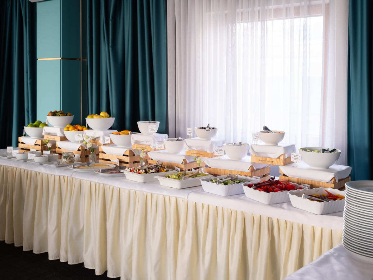 Шведский стол с богатым выбором классических европейских блюд :